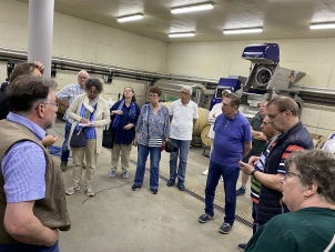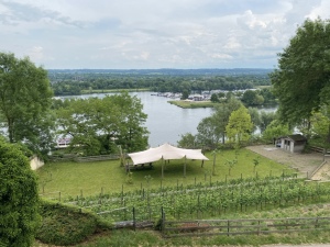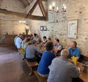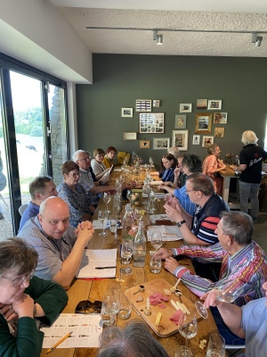 Danach dürfen wir an den rustikalen Tischen nebenan auf der Aussichtsplattform noch einen 2023 Schouwen-D®uiveland Souvignier Gris, Wijnhoeve De Kleine Schorre probieren, den Hendrik Ruitenberg gekühlt für uns mitgebracht hat. So gestärkt fällt der Abstieg zum Bus leichter als der vorherige Aufstieg und wir fahren zum nächsten Weingut. |